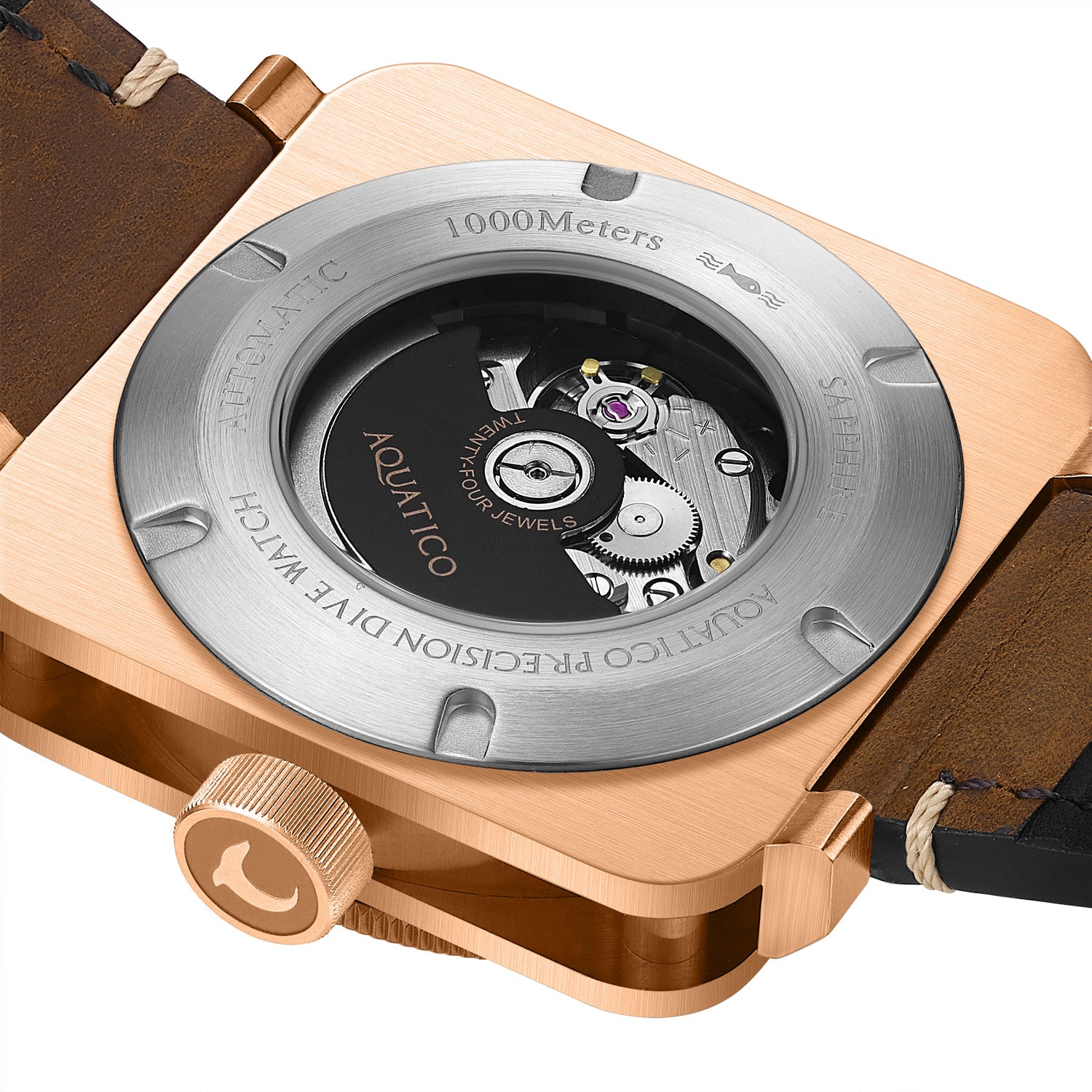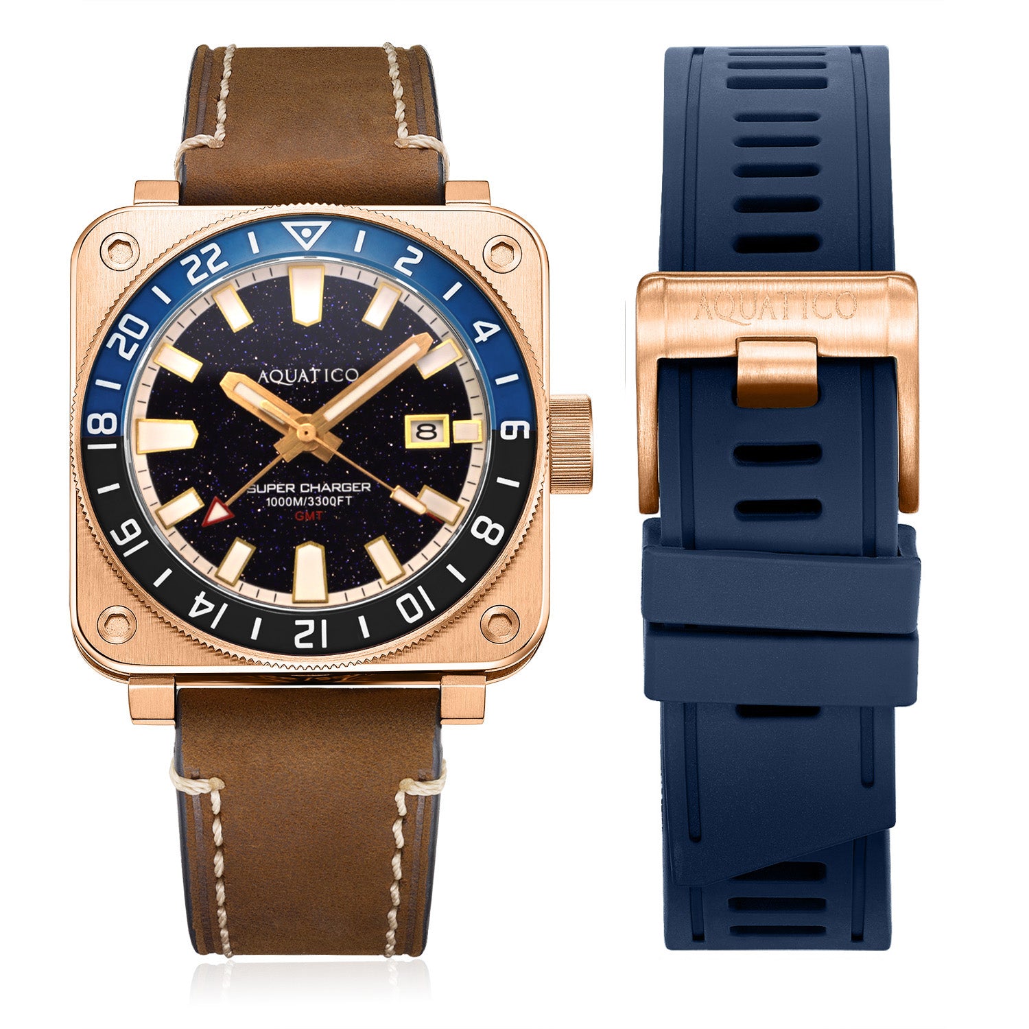 The Super Charger GMT stands out with its stylish square case, crafted from solid marine-grade CuSn8 bronze—a material known for its rich patina and durability. At its heart lies a shimmering natural Aventurine dial, evoking a star-filled night sky. Applied indexes glow with Swiss Super-LumiNova® BGW9, ensuring legibility in any light.
