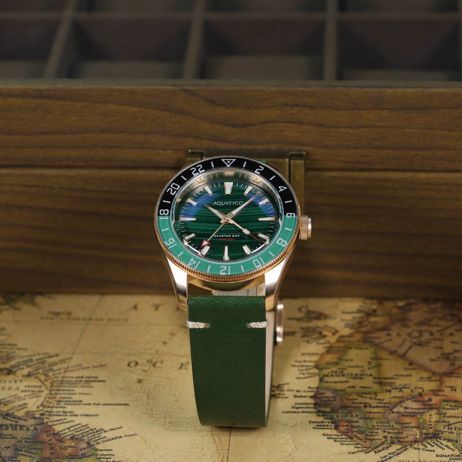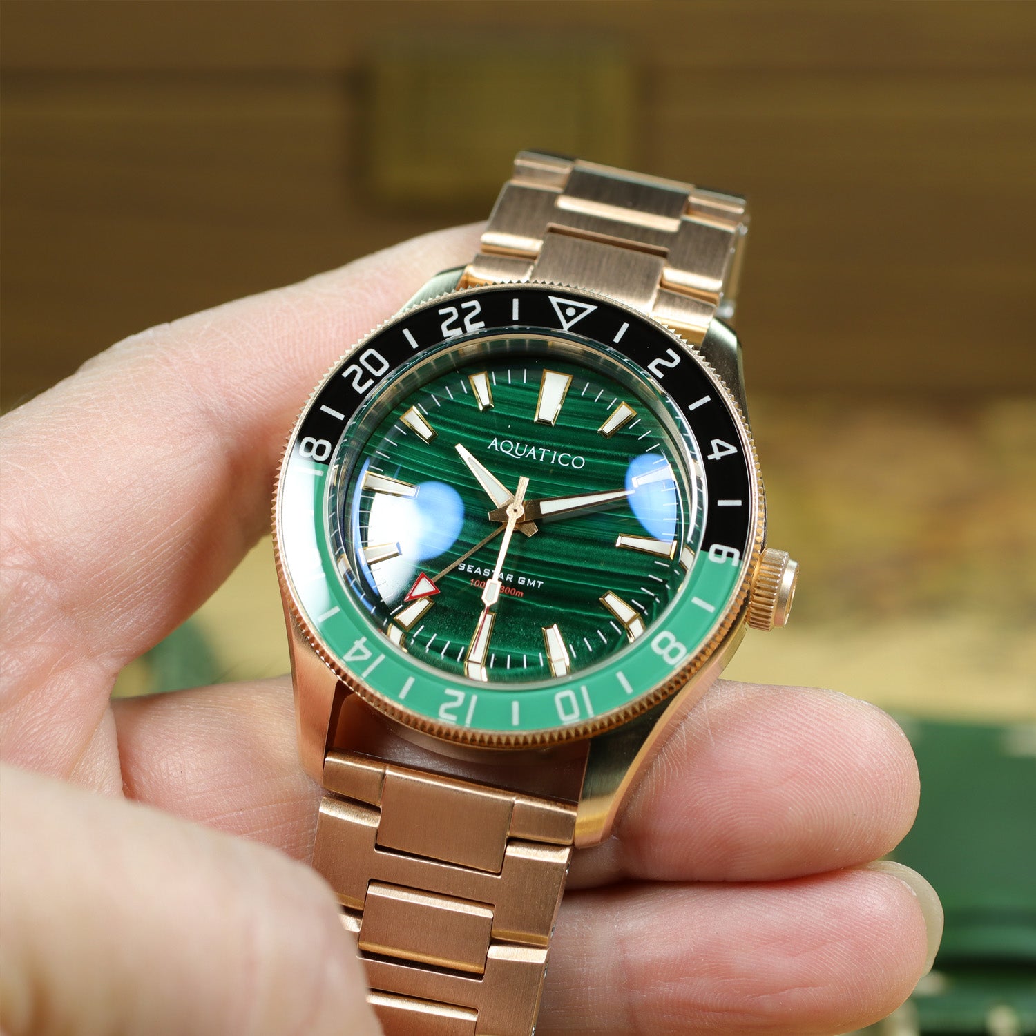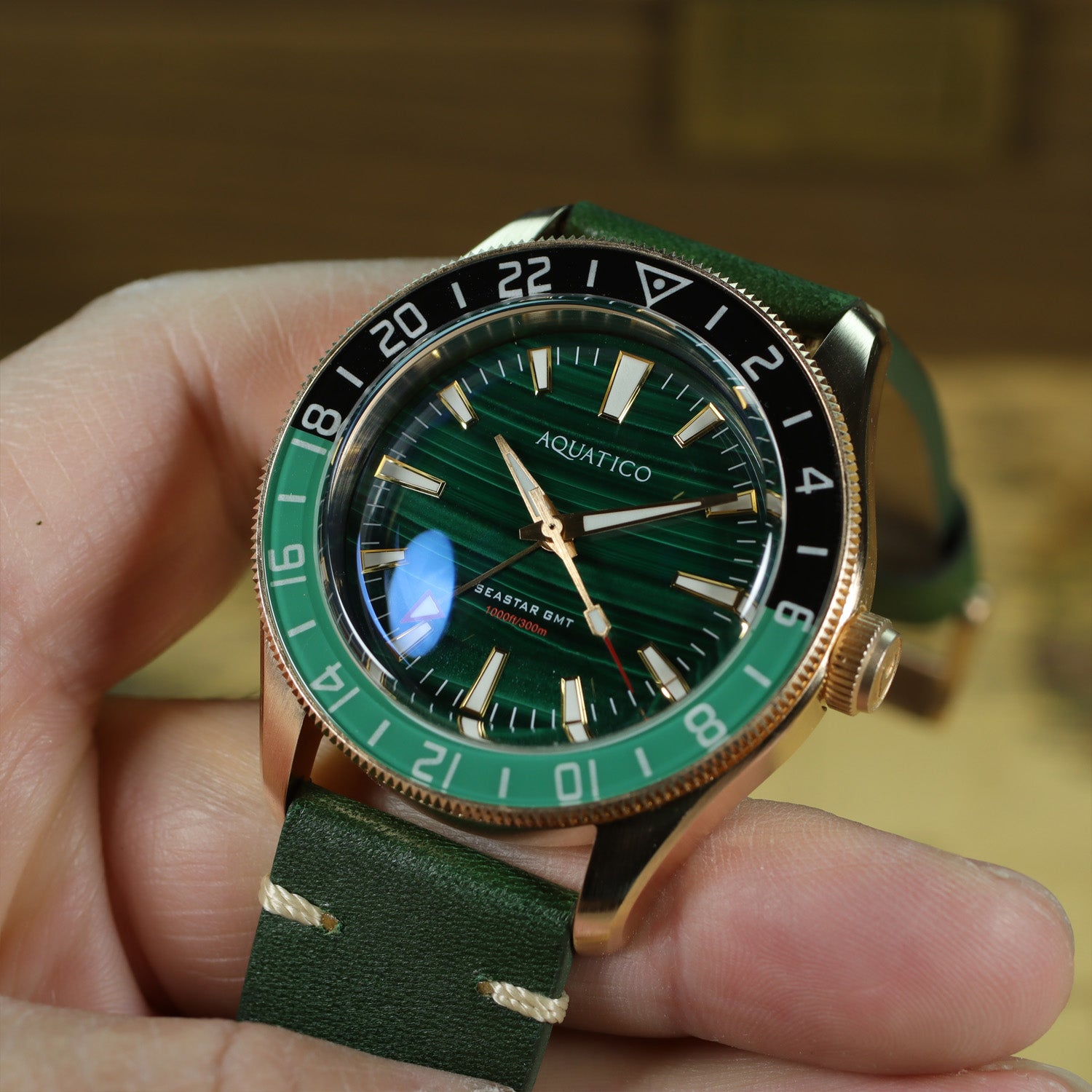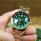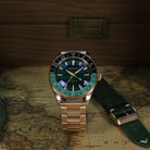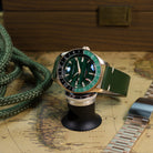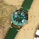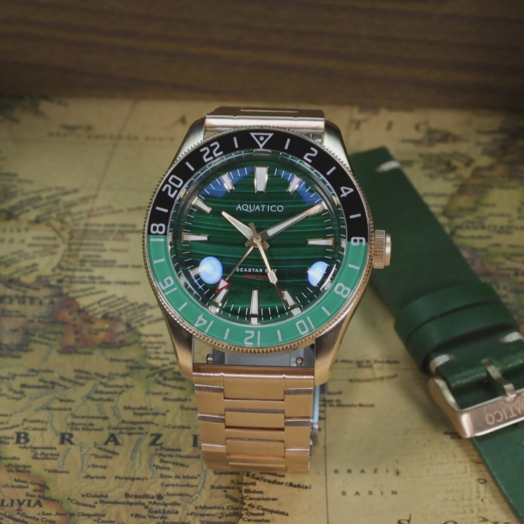 Crafted from solid Bronze CuSn8 and powered by a reliable Seiko Automatic GMT, this special anniversary piece showcases a stunning Green Malachite dial — a stone long admired for symbolizing peace, health, and the value of precious time.