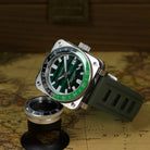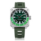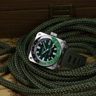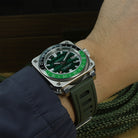 The Steel Man GMT Malachite Dial is a stunning blend of elegance, precision, and adventure-ready performance. Its striking green Malachite dial showcases the natural beauty of this unique stone—celebrated for its rich layers, vibrant emerald tones, and timeless character. Each dial carries its own natural pattern, making every watch truly one-of-a-kind.