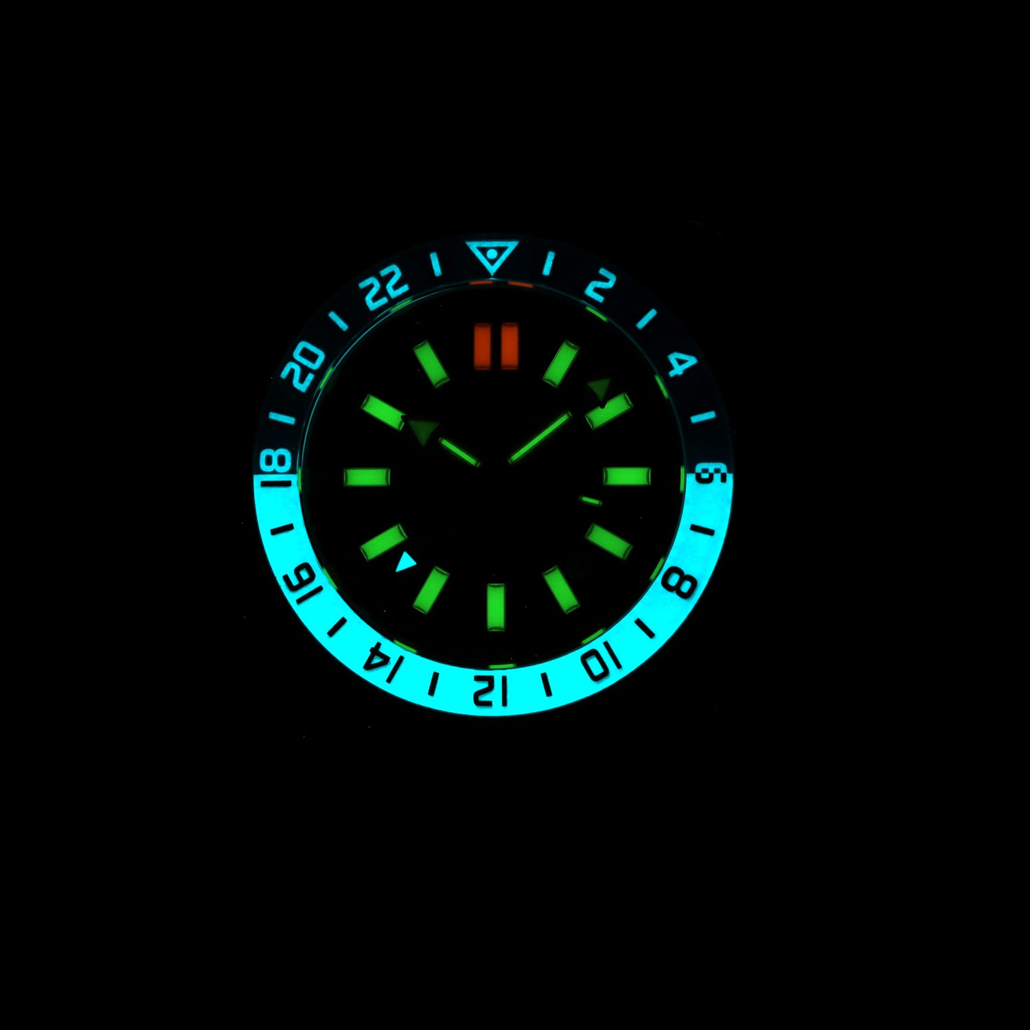 At the heart of this timepiece lies a Seiko-made NH34 GMT movement, showcased through an exhibition case back, providing not only exceptional accuracy but also a captivating glimpse into the intricate mechanics.