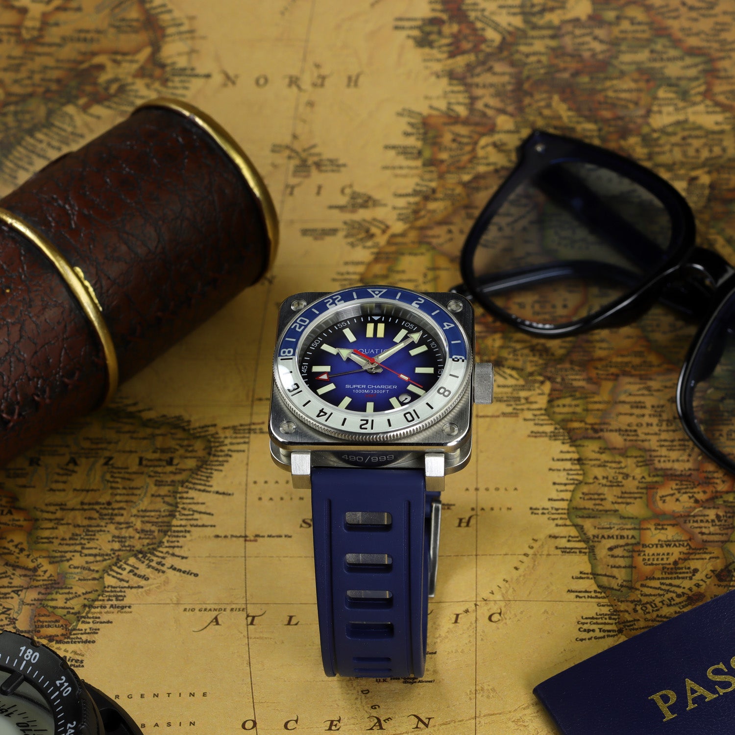 Completing this exceptional timepiece is a comfortable and robust FKM rubber strap, perfectly tailored for both form and function. The Aquatico Steel Man GMT Watch is a testament to meticulous craftsmanship and ingenuity, making it an indispensable companion for those who demand nothing but the best. Elevate your wristwear collection with this extraordinary blend of style, substance, and precision.