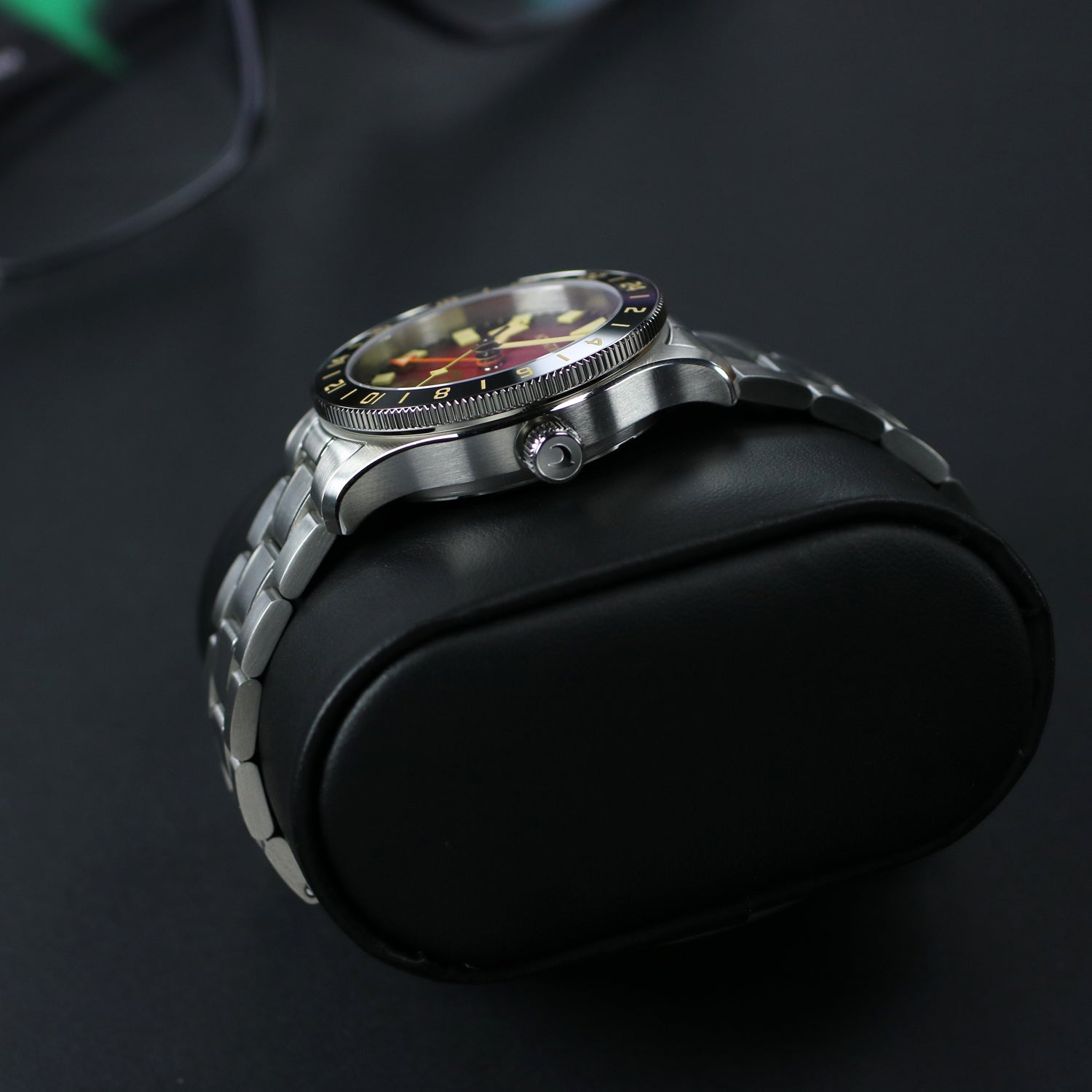 Precision Movement At the heart of this limited-edition watch lies the reliable Japan Seiko NH34 automatic GMT movement. Known for its accuracy and robustness, this movement ensures seamless tracking of dual time zones, making it an ideal companion for travelers and professionals.
