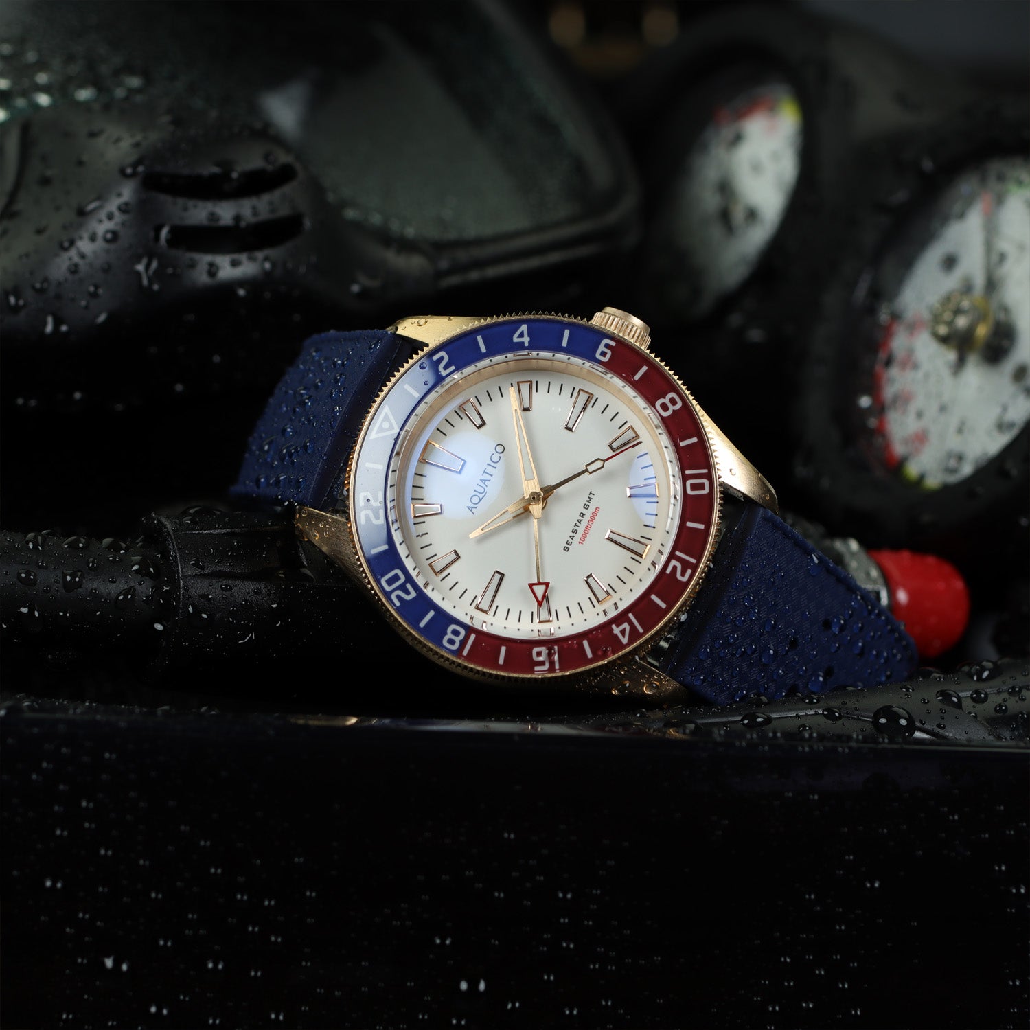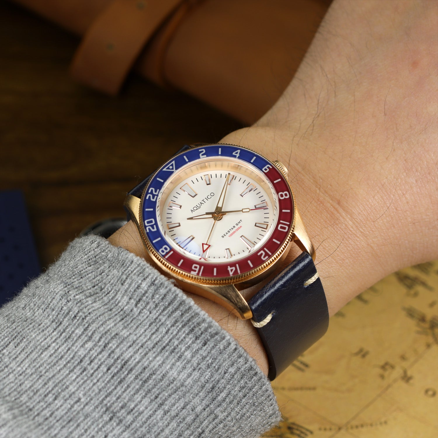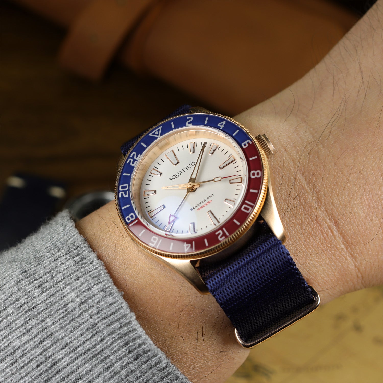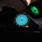 The Bronze Sea Star GMT Full Lume Dial is a versatile tool watch designed for everyday wear and serious performance. Crafted from marine-grade solid CuSn8 bronze and weighing just 105g, it offers exceptional comfort with a distinctive, evolving patina. Powered by a reliable Seiko automatic GMT movement, it features a scratch-resistant sapphire Pepsi bezel and a fully luminous dial coated in Super-LumiNova BGW9 for outstanding night visibility. With 300 meters of water resistance and supplied with leather, NATO, and rubber straps, the Sea Star GMT is built to adapt effortlessly from daily carry to adventure.