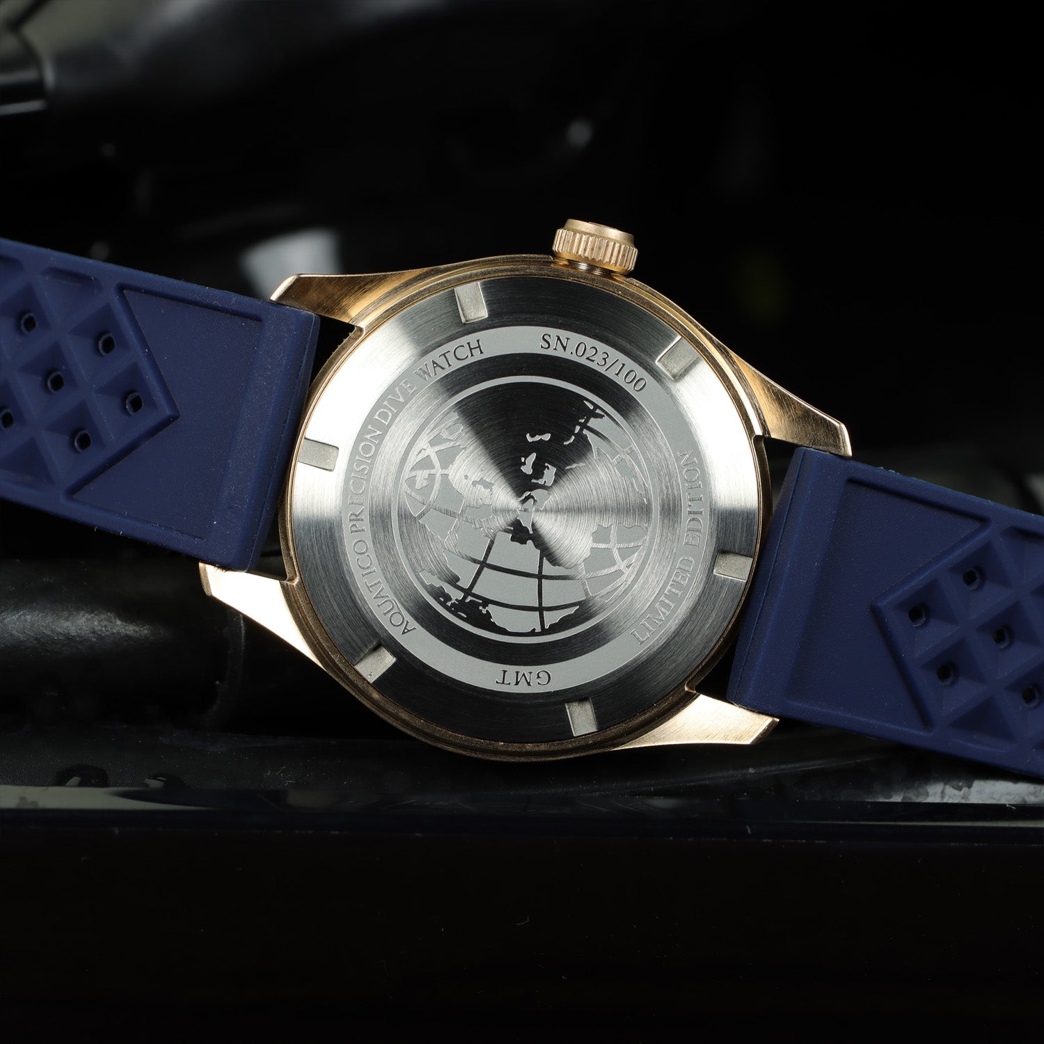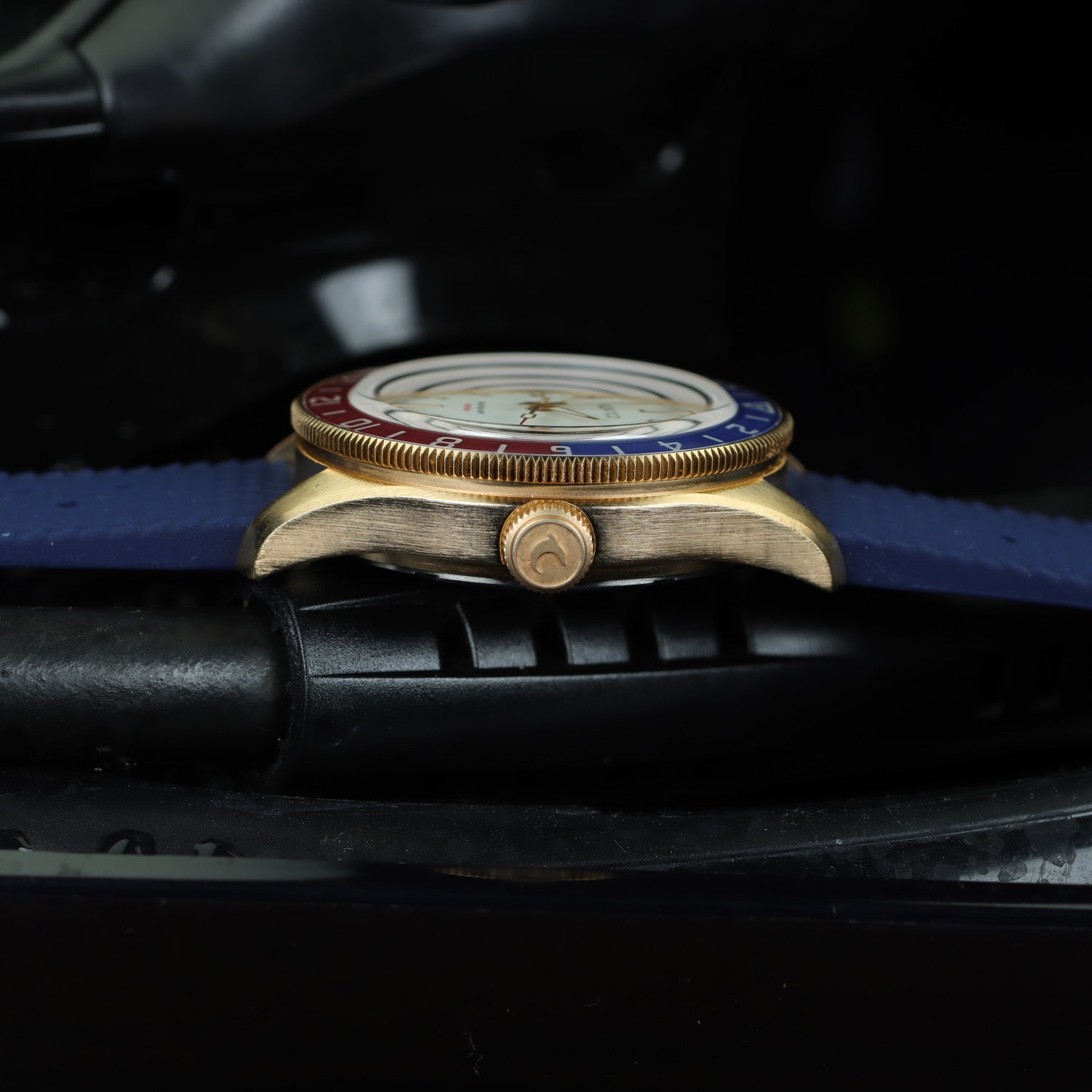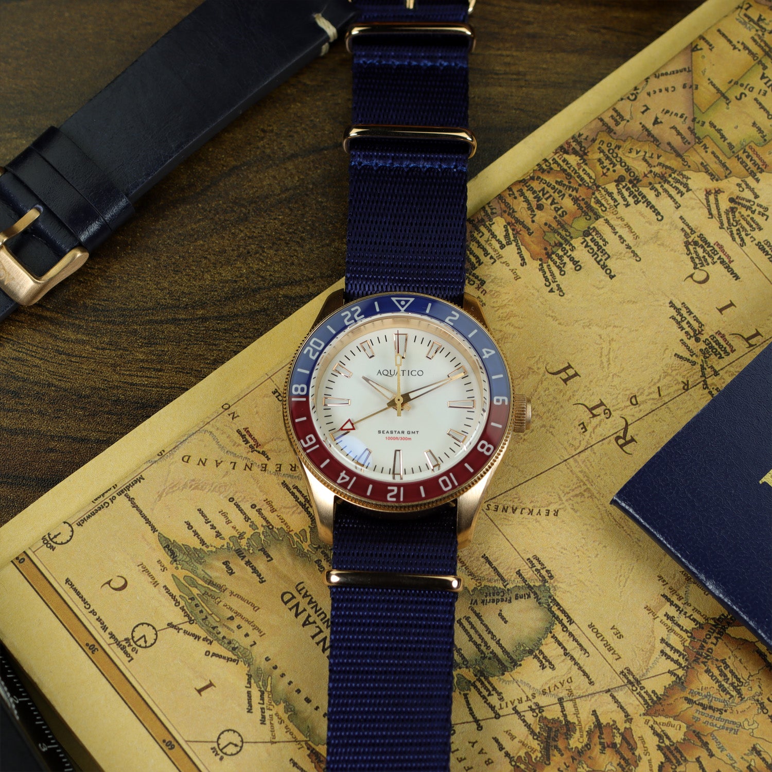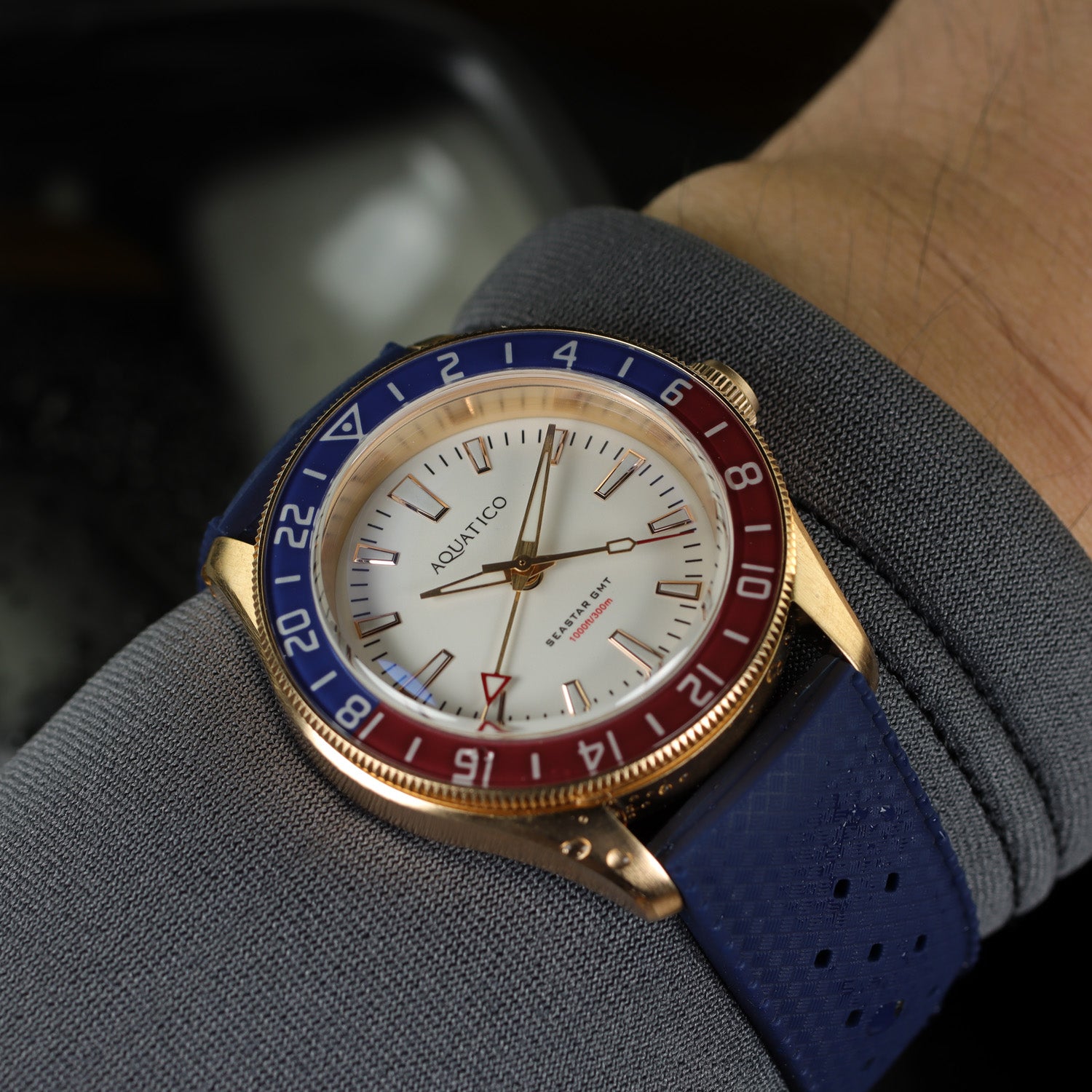The Bronze Sea Star GMT Full Lume Dial is a versatile tool watch designed for everyday wear and serious performance. Crafted from marine-grade solid CuSn8 bronze and weighing just 105g, it offers exceptional comfort with a distinctive, evolving patina. Powered by a reliable Seiko automatic GMT movement, it features a scratch-resistant sapphire Pepsi bezel and a fully luminous dial coated in Super-LumiNova BGW9 for outstanding night visibility. With 300 meters of water resistance and supplied with leather, NATO, and rubber straps, the Sea Star GMT is built to adapt effortlessly from daily carry to adventure.